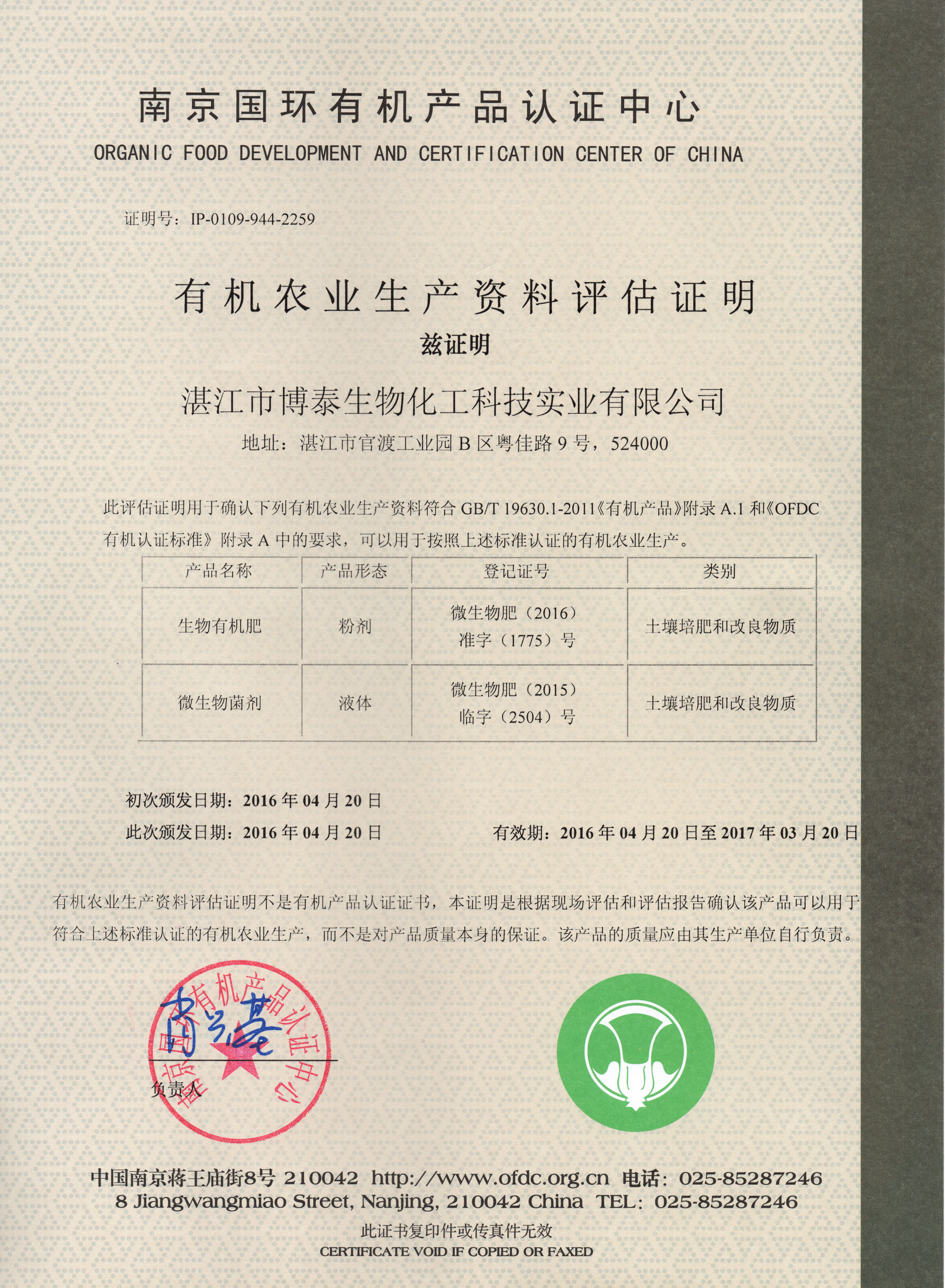 圖為“生物有機(jī)肥”和“微生物菌劑”——有機(jī)產(chǎn)品生產(chǎn)資質(zhì)認(rèn)證證書